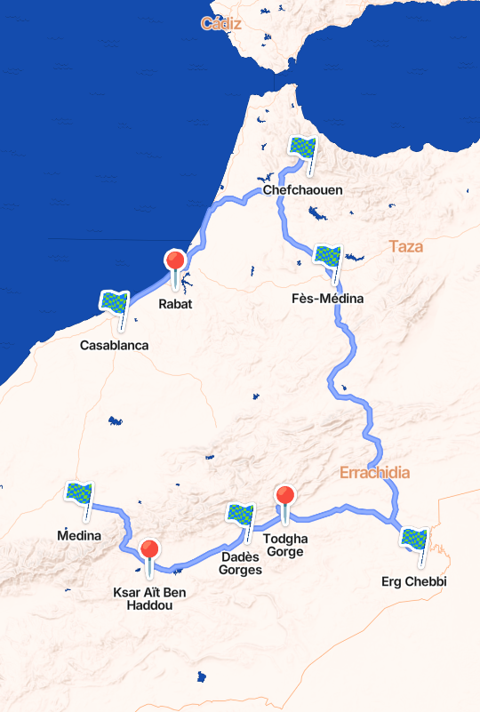 Agdez, Boumalen Dades, Casablanca, Chefchaouen, Errachidia, Fes, Marrakech, Merzouga, Midelt, Ouarzazate, Rabat, Toudgha Gorges