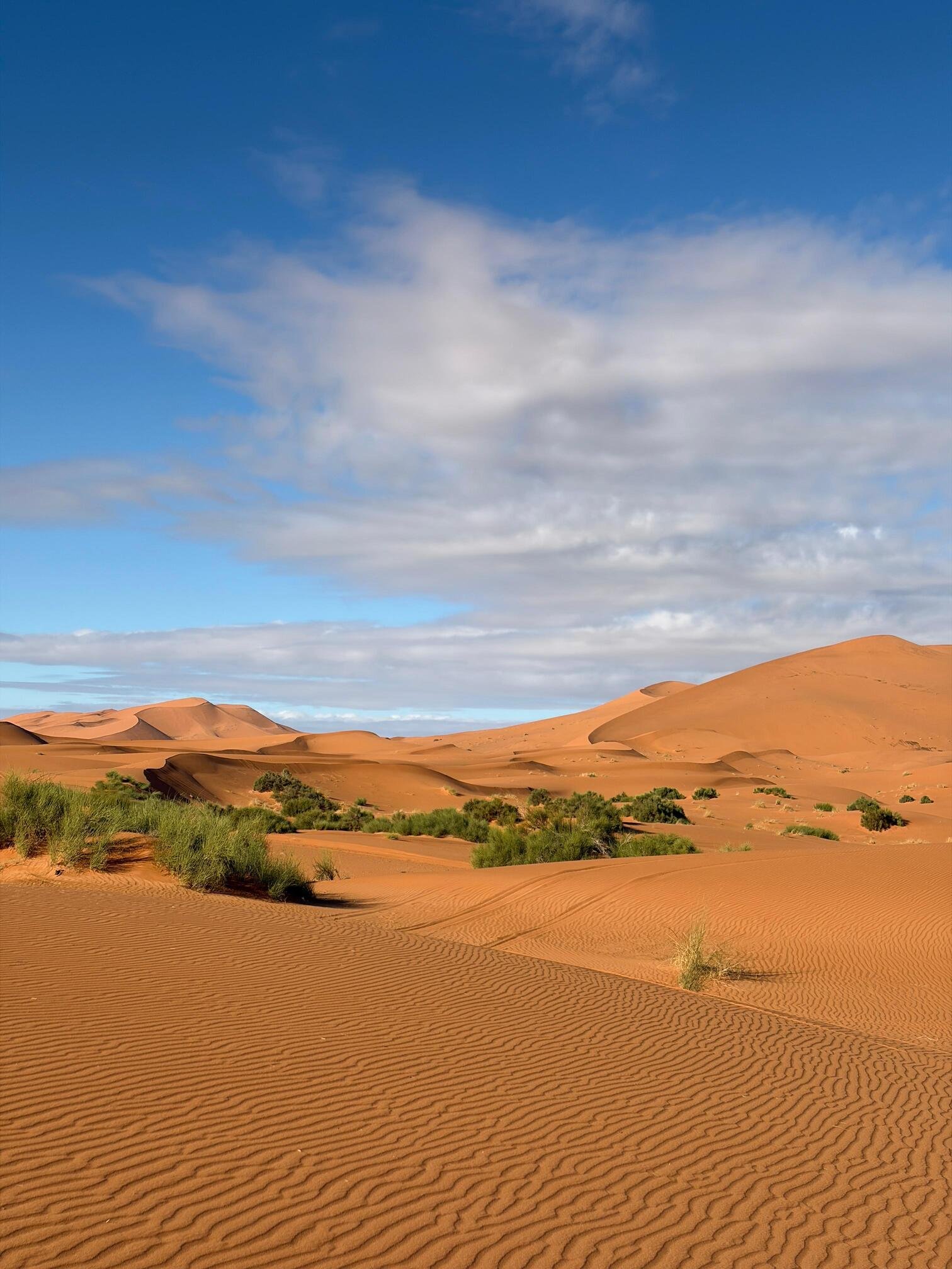 The Sahara areas brings extreme contrasts: scorching days (up to 40–50°C in summer) and surprisingly cold nights (dropping to near-freezing in winter). Sand, wind, and intense sun are constant, so prioritize protection, layering, and comfort, especially for camel rides, dune climbs, or overnight camps.